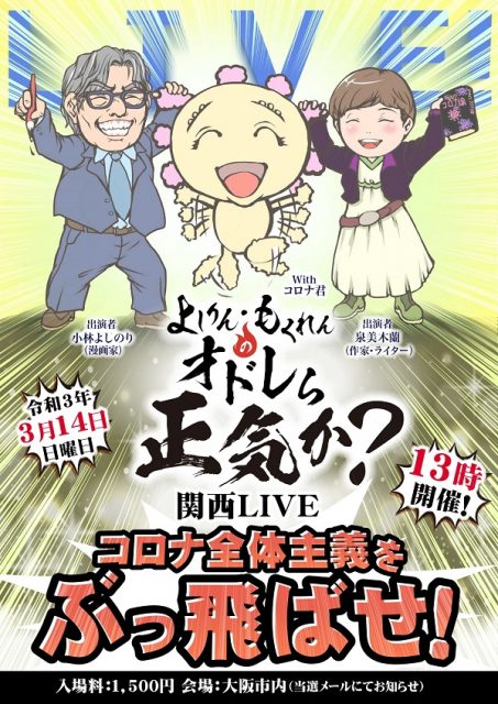 もう、こんな騒ぎは絶対に終わりにしなければなりません。そのためには、まずこのコロナ禍に対して声を挙げる必要があります。疑念を抱いている人、違和を感じ取っている方、まずは声を挙げるための第一歩として、3月14日、日曜日に開催される「オドレら正気か?関西LIVE」に参加されませんか?