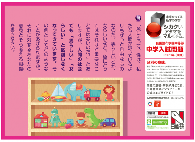 SDGsの目標5「ジェンダー平等を実現しよう」に象徴されるように、「男らしさ」や「女らしさ」といったジェンダー(社会的、心理的性別)に基づく、不当な扱いをなくそうとする動きが、世界で活発になっています。それゆえ、ジェンダーに敏感であることは、これからの時代を生きる子ども達にとって不可欠です。この問題は、こうしたジェンダーへの意識を子ども達の中に高めることにつながる問いだと言えるでしょう。