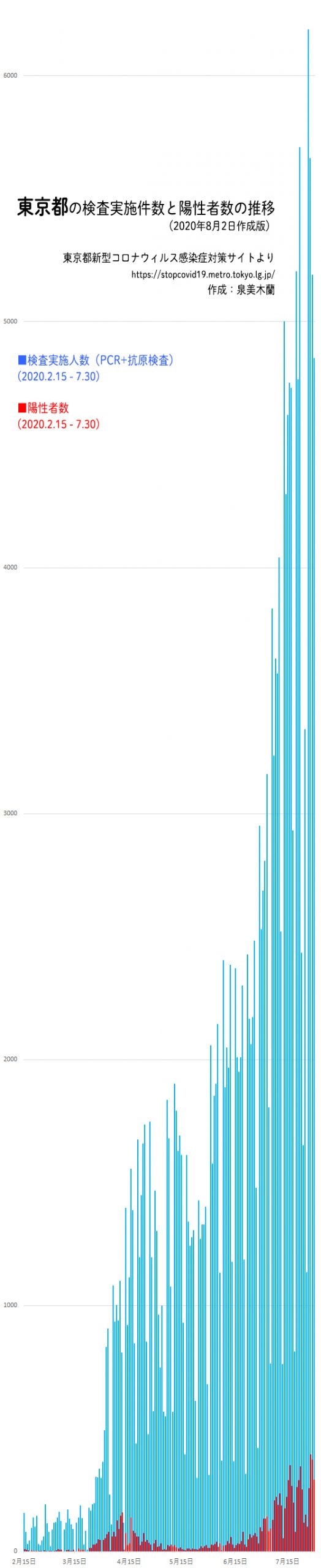 東京都の検査数と陽性者数の推移、8/2新版です。