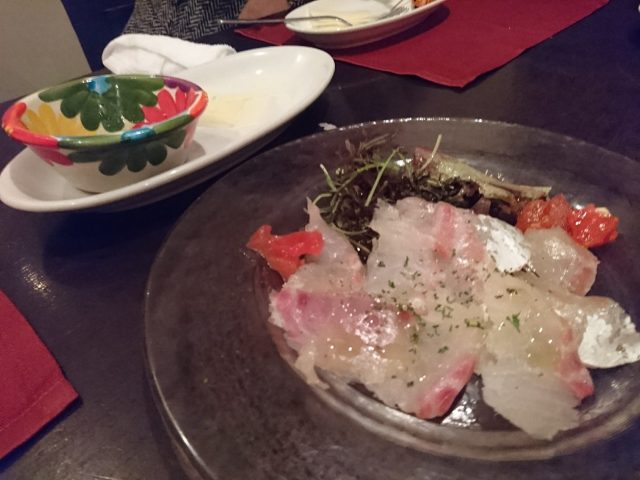 そんな中、早くも前菜とカルパッチョがきました~。