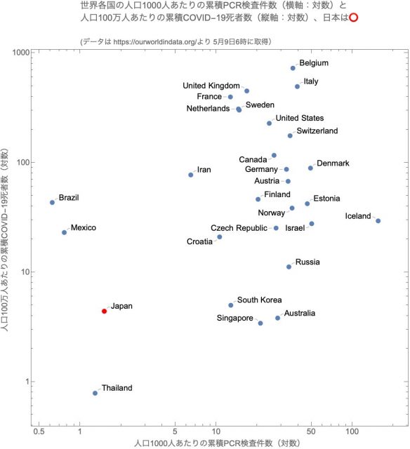 世界各国の人口1000人あたりの累積PCR検査件数(横軸:対数)と、