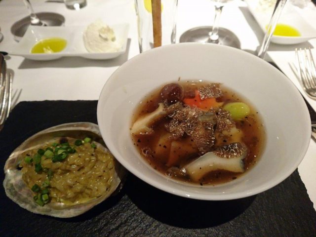 あわびの洋風茶わん蒸しと、肝のリゾット。