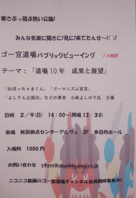 私は、ゴー宣道場東北設営隊員ではありませんが、小林先生のブログを読んで、ゴー宣読者として自分で考え、言わば勝手に(^◇^;)パブリックビューイングを開きたいと思い、秋田で開催いたします!