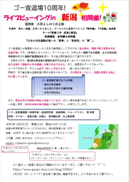こんにちは。この度、新潟で初の「ゴー宣道場」パブリックビューイングが行われます。