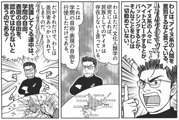 よしりん先生ははっきり「アイヌ系の人間を差別するな」と言った上で、ただ学問の自由・表現の自由を行使しただけであり、それだけで差別者扱いする者がいると書き、その代表が香山リカだと言っているのです。
