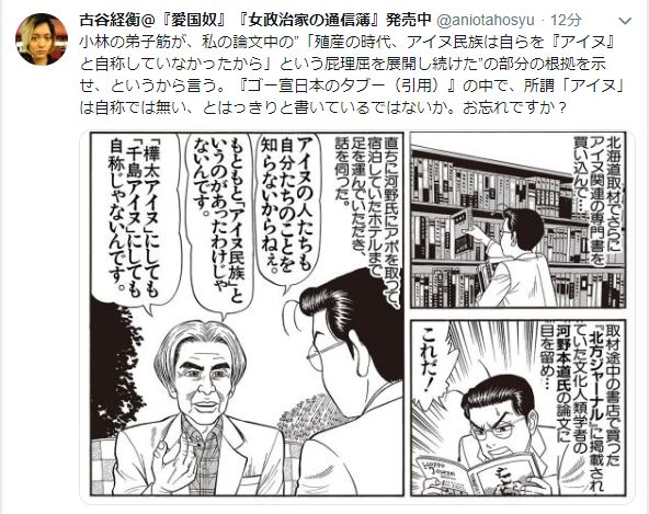 〈小林の弟子筋が、私の論文中の”「殖産の時代、アイヌ民族は自らを『アイヌ』と自称していなかったから」という屁理屈を展開し続けた”の部分の根拠を示せ、というから言う。『ゴー宣日本のタブー(引用)』の中で、所謂「アイヌ」は自称では無い、とはっきりと書いているではないか。お忘れですか?〉