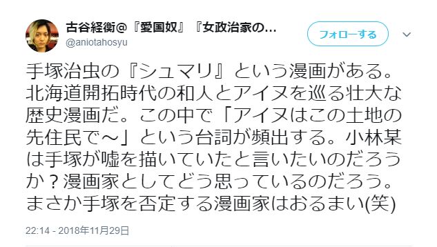 手塚治虫の『シュマリ』という漫画がある。北海道開拓時代の和人とアイヌを巡る壮大な歴史漫画だ。この中で「アイヌはこの土地の先住民で~」という台詞が頻出する。小林某は手塚が嘘を描いていたと言いたいのだろうか?漫画家としてどう思っているのだろう。まさか手塚を否定する漫画家はおるまい(笑)