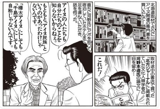 小林は漫画の以下のシーンにも記しているとおり、北海道を取材し、専門書を大量に入手し、北海道ウタリ協会の『アイヌ氏』編集委員も務められた文化人類学者・河野本道氏の論文を読み、直接話を伺って執筆しています。