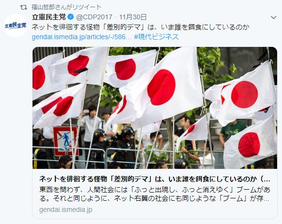 古谷経衡のデマ記事を拡散している立憲民主党の公式ツイッターを、呆れたことに、福山哲郎幹事長がリツイートしていました。
