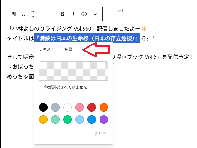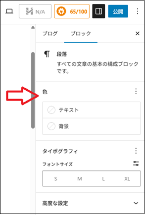ブログ記事編集画面の右にある色変更を使うと、段落(ブロック)内すべての文字色が変更されますよね。