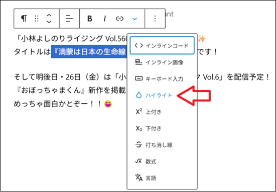 下矢印のアイコンをクリックした後、「ハイライト」を選択。