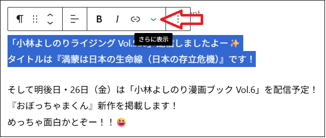 段落内の一部の文字色を変更したい場合は、変更したい部分をドラッグで選択した状態で、「下矢印のアイコン」をクリックしてください。