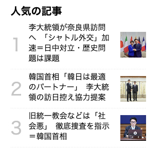 さて、上記のニュースをソウル聯合ニュースのサイトで読んでいる時、目に止まったのが人気記事のランキング。