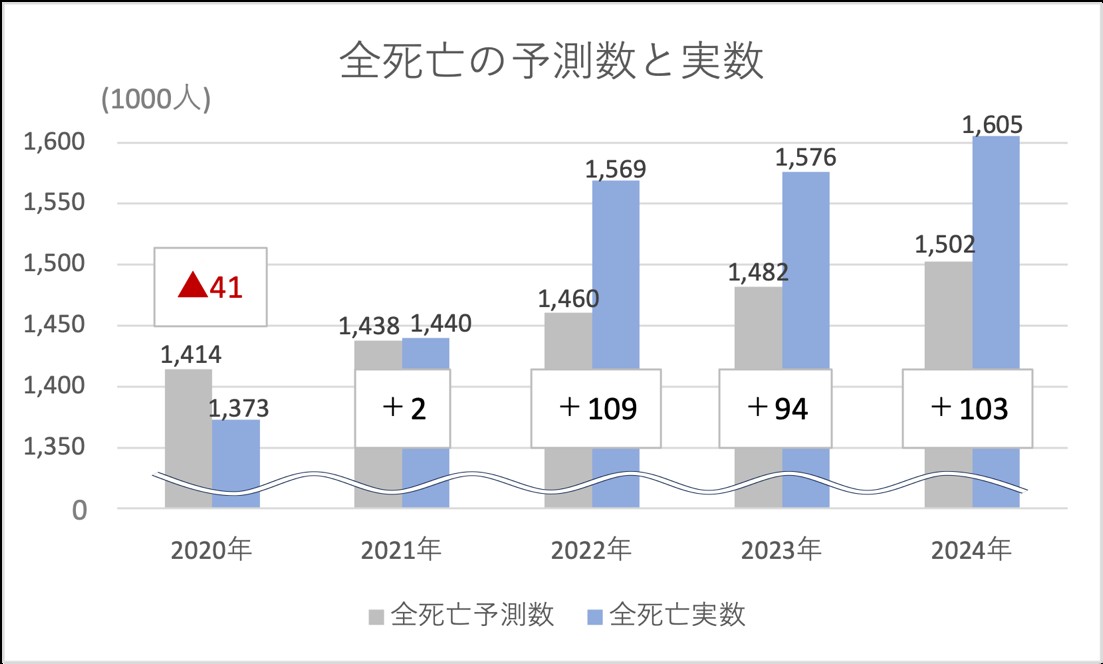 年金の財政検証にも使われる死亡中位推計は、高齢者数が捕捉されて移民のない日本では正確な予測の筈ですが、コロナワクチン以降の死亡数はこれを大きく上回ります。この推計値と比較した超過死亡の累積は2020年から2024年の5年間で266千人、過少死亡の2020年を除いた4年間で307千人となります※(a)。