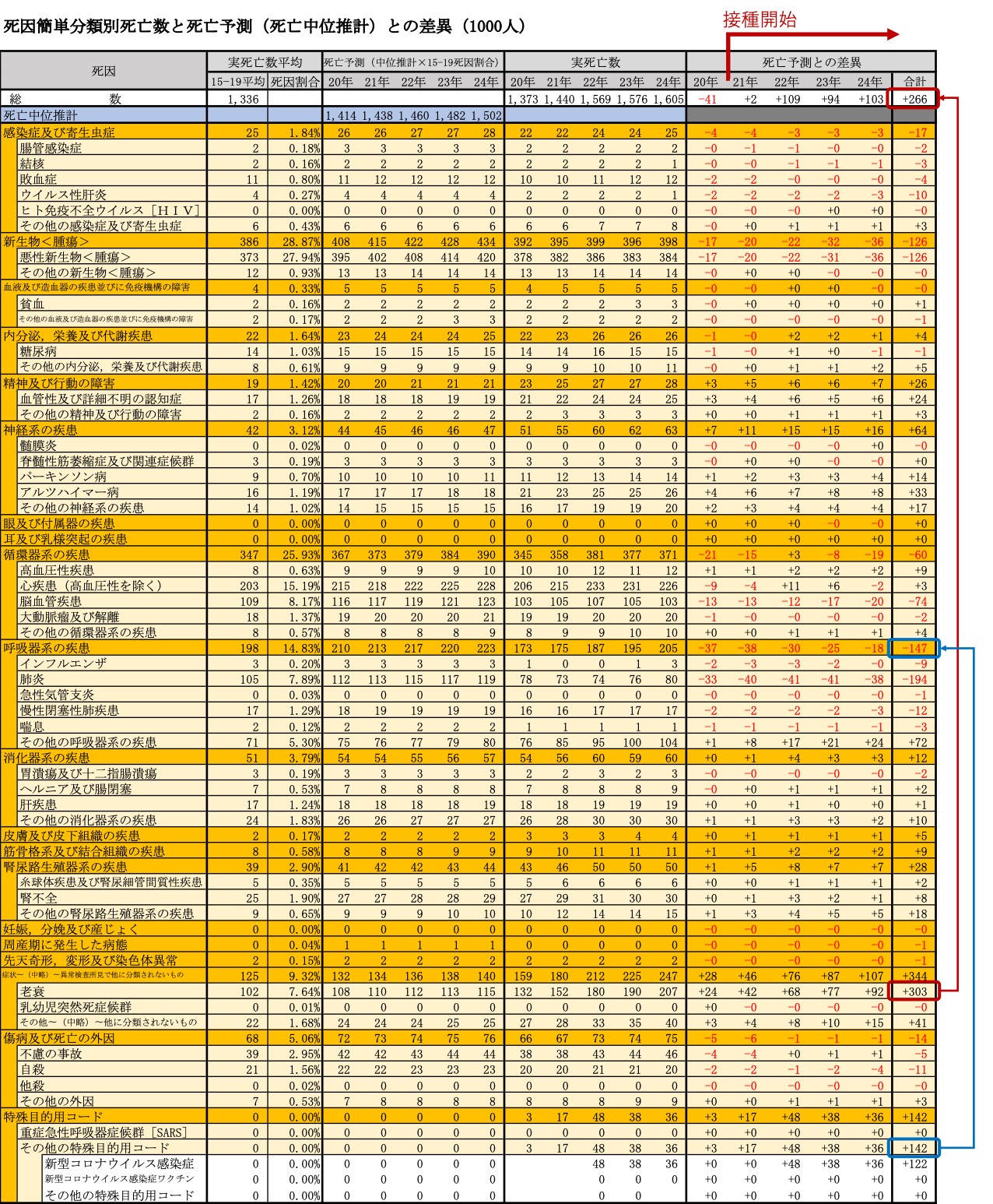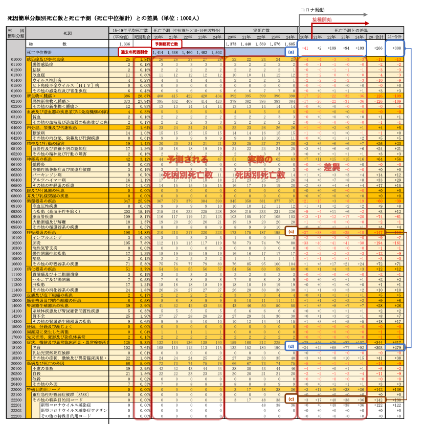 この死亡中位推計と2015年〜2019年までの5年間の平均死因別割合を掛け合わせ、死因別の予測値を出して実数との差を見てみます。すると超過死亡の原因と推定できる死因が浮かび上がってきます※(b)。