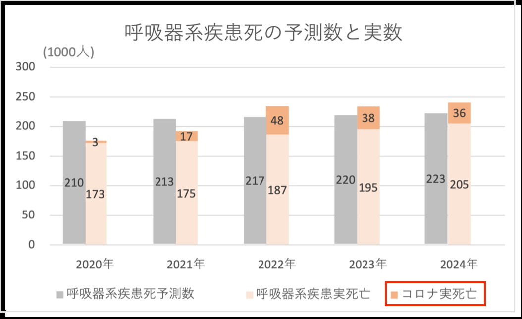 5年間のコロナ死亡は142千人で、勿論コロナ脳の人々は「超過死亡はコロナが原因じゃー」と喚くのですが、同期間で呼吸器系疾患死亡は147千人減少しており、グラフにすると※(c)のようになります。つまり呼吸系疾患の総数としてみれば死者はほぼ予想通りで、単にコロナへの死因の付け替え。最初からパンデミックなど起こってなかったという結論になります。もちろん集団ヒステリーの中にいた日本人にこの指摘が受け入れがたいことは分かりますが、数値は事実を雄弁に語ります。