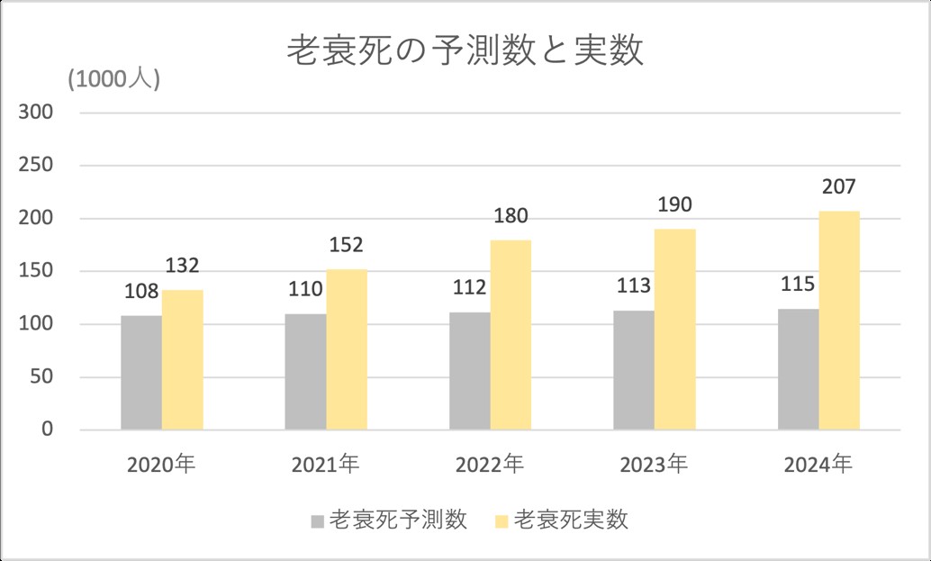 2025年の死亡数は速報値で2024年水準をキープして一向に減る気配がありません※⑤。日本が2021年を境に一気に高齢化が進んだことは否定できません。