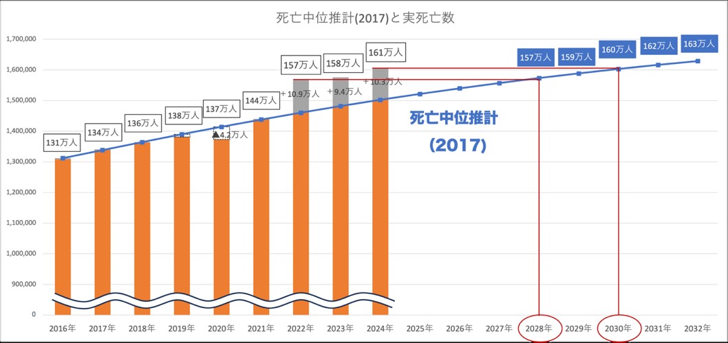 ※(e)死亡中位推計(2017)と実死亡数