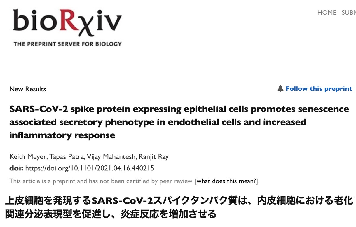 ※③)SARS-CoV-2 spike protein expressing epithelial cells promotes senescence associated secretory phenotype in endothelial cells and increased inflammatory response(bioRxiv)