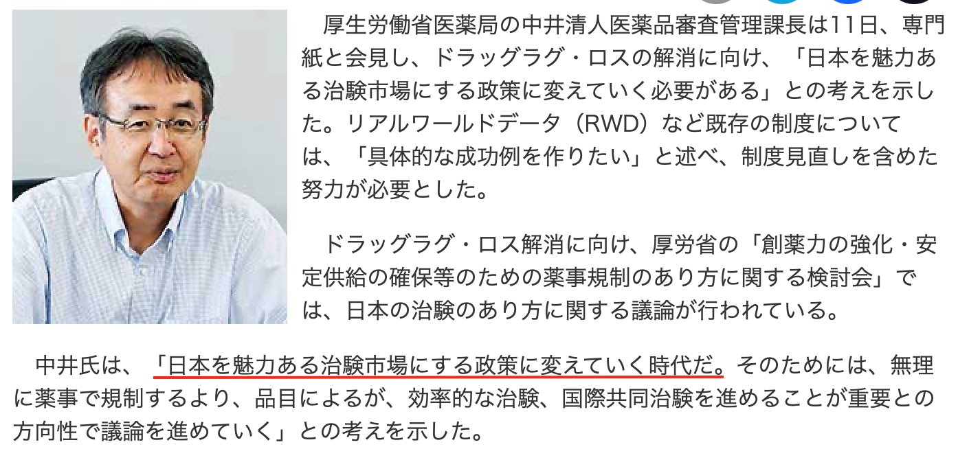 ※②)日本を魅力ある治験市場に‐中井医薬品審査課長「RWDで成功事例作る」(薬事日報)