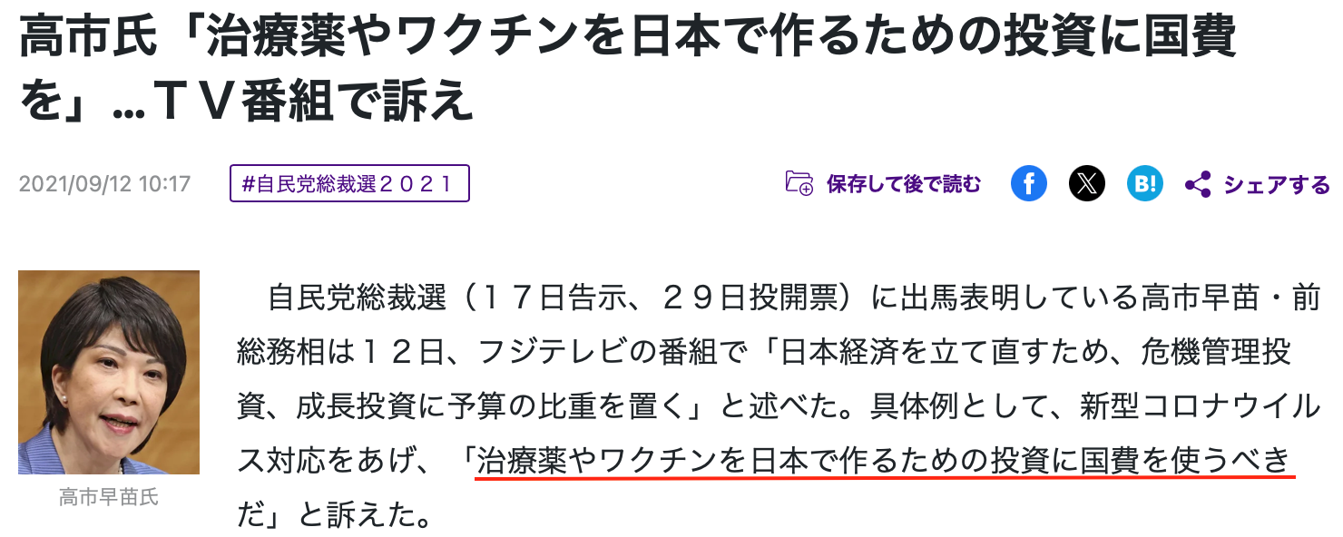 ※④)高市氏「治療薬やワクチンを日本で作るための投資に国費を」…TV番組で訴え(読売新聞オンライン)
