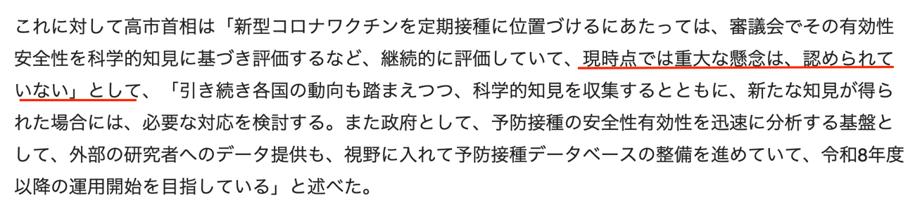 高市は史上最大の薬害となったコロナワクチンに対してもブレがなく、2021年の総裁選から手放しの礼賛で、総理になった2025年の国会答弁でも安全性に問題がないと答弁しました※③④⑤。しかも彼女自身はワクチン副反応で苦しんだ身にも関わらずです。