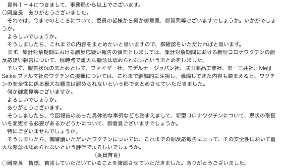 ワクチン被害が史上最悪でも中止にできないのは、この審議会が「安全性に重大な懸念は認められない」という見解だからです。議事録を辿ると、最初に製薬会社からカネを貰う利益相反委員の確認があり、感情も抑揚もない慇懃無礼な言葉で資料をめくり進める退屈な時間が続きます※②。委員たちは人が死んだ報告にも沈黙し、事務局の「重大な懸念は認められないということでよろしいでしょうか」という問いかけに無言で頷いてシャンシャン。自分たちは既に射っていないくせに、今も射たれているワクチンに議論もなく、イエスマンが台本通りにムラの定めを確認する儀式。この有り様は実に日本的で、もはや無形文化財的ですらあります。