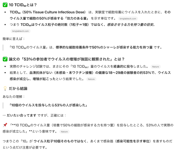 ※⑦)ウイルス粒子の多くは不完全で感染能力を持たないため、「実際に感染能力を持つ最小の感染性粒子の数(感染単位)」で考えます。以下Chat-GPTの回答です。