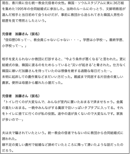 さて旧統一教会は「エバがサタンと不倫して出来た子孫の国が日本」という宗教で、「その原罪故に日本女性を韓国男性に貢がせる」という教えです※②。合同結婚式は今も行われており、日本女性を韓国の農村地域の信者でもない男性にあてがっています※③。このイカれた教義が続く恐怖は、破滅を味わった山上の母親が脱会できない事実が示しています※④。私はごく普通の素朴な愛国心を持つ人間ですから、反日カルトの実態を見る限り※⑤、普通に解散命令を出すべきで、政権与党と結びついているなんてとんでもない事と考えます※⑥-a。