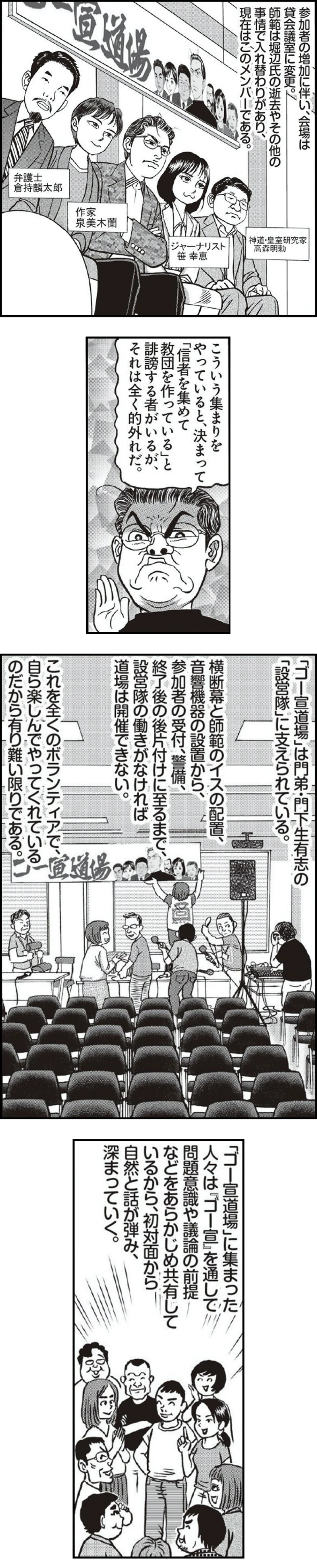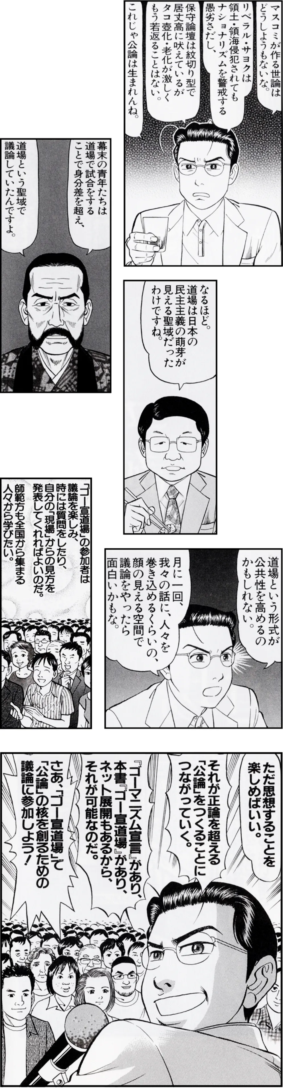 平成23年(2010)4月11日、東京・東中野の骨法道場にて、第1回ゴー宣道場を開催。幕末の青年たちが道場という聖域で身分差を超え、議論をして「公論」を形成していたという古事に倣い、「身を修め、現場で戦う覚悟を作る公論の場」をモットーに掲げた。最初期から皇統問題を扱い、国会議員をゲストに招くなど活発な展開。参加者増加のため会場をより広い会議室などに移し、ホール会場での「拡大版」も行った。