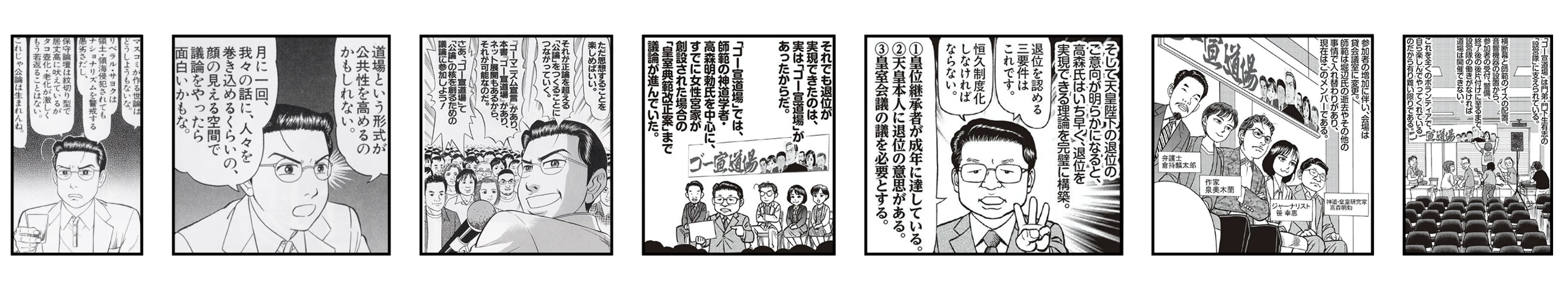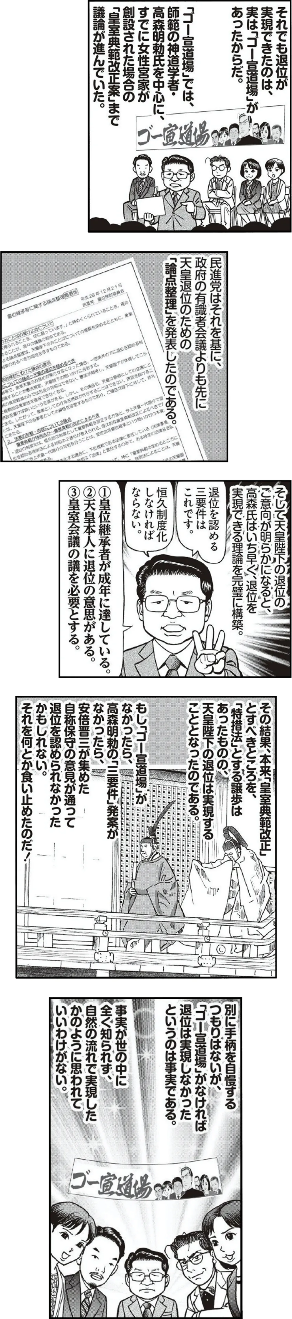 平成28年(2016)8月8日、天皇陛下(当時)は生前退位のご意向が明らかとなるビデオメッセージを発表されたが、当時の安倍政権はこれを完全に無視する方針だった。そこでゴー宣道場は生前退位を可能とする法改正案をいち早く作成・発表。野党第一党・民進党を動かし、国会案件として生前退位を実現させた。後に安倍政権はこれを自らの手柄のように宣伝したが、ゴー宣道場がなければ、決して実現してはいなかった。